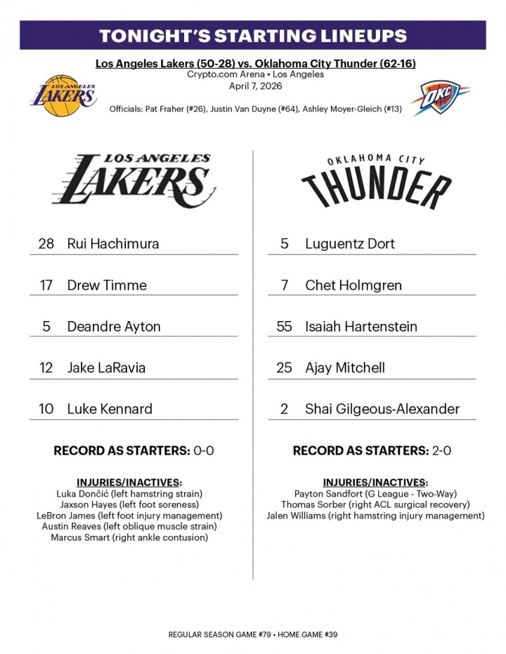 湖人首发:肯纳德、拉拉维亚、八村塁、蒂米、艾顿