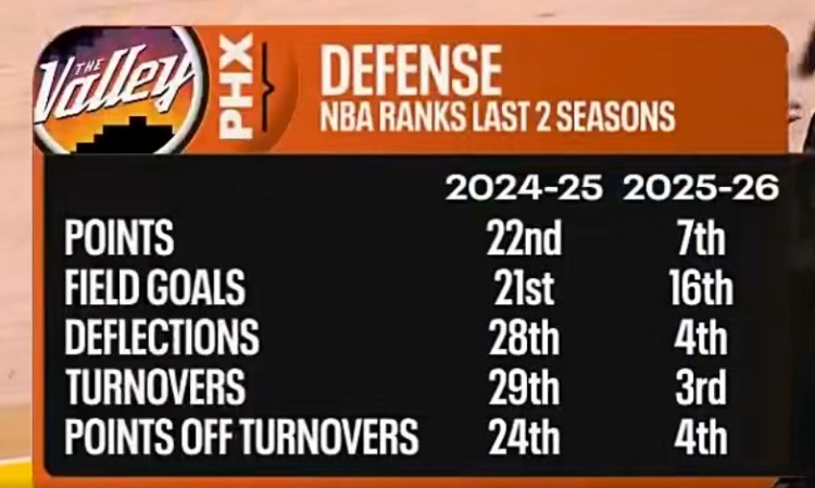 本赛季太阳在失分、对手进球数、场均干扰防守次数、造对手失误、利用失误得分等多项数据上,相比上赛季都有巨大提升,多项数据联盟前列。