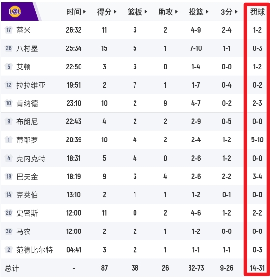 本场湖人全队获得31次罚球,仅命中14球。