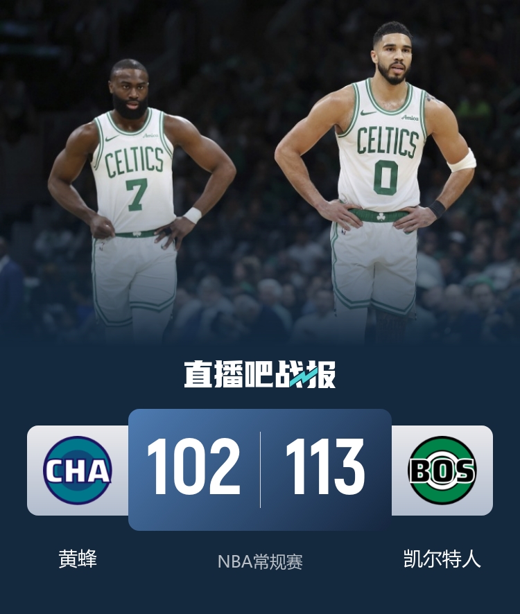 开场后鲍尔状态火热内突外投频频拿分,刚开始凯尔特人依旧整体发挥紧咬比分,奎塔在内线表现也是十分活跃,首节尾声黄蜂轮换阵容一波9-0的攻势建立领先。第二节凯尔特人外线找到手感接连通过远投追分,黄蜂外线手感不赖也连续用三分回应,凯尔特人一度反超比分,但黄蜂立马回应攻势,半场过后黄蜂领先6分。易边再战,塔图姆开启得分模式接连砍分,鲍尔毫不示弱也连续回应,两队陷入拉锯战,第三节尾声黄蜂进攻突然断电,凯尔特人一波10-0完成反超。最后一节凯尔特人继续保持场上优势,黄蜂命中率下降未能再追上比分,最终凯尔特人击败黄蜂取得4连胜。