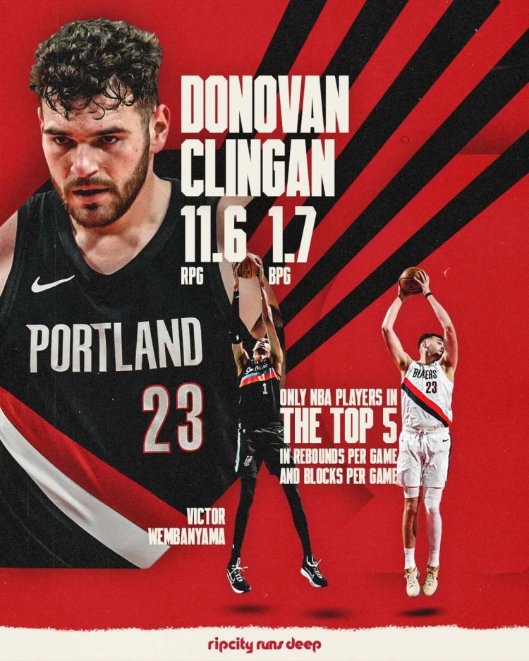 本赛季,克林根场均12.1分11.6板1.7盖帽,其中篮板(第3)和盖帽(第5)均位列联盟前五。而本赛季,联盟中只有克林根和文班11.5板(第 4)3.1封盖(第1)能够在这两项数据中同时位列联盟前五。
