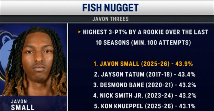 灰熊次轮48号秀斯莫尔本赛季三分命中率43.9% 创近10年来新秀纪录