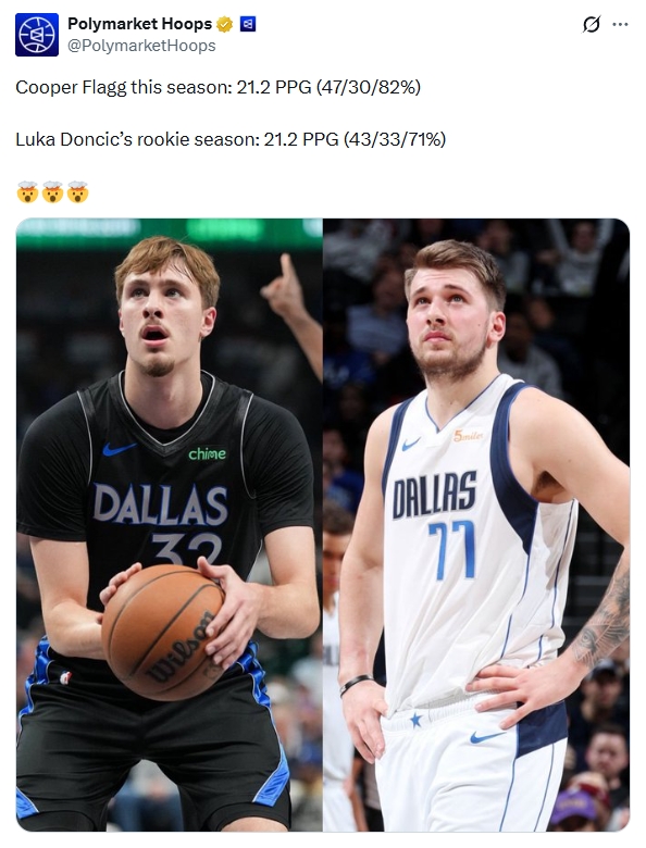 直播吧04月09日讯 数据媒体Polymarket Hoops更新动态,晒出弗拉格和东契奇新秀赛季的数据对比: