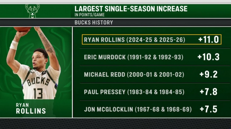 雄鹿队史单赛季场均得分涨幅榜:罗林斯+11.0第一 里德+9.2第三