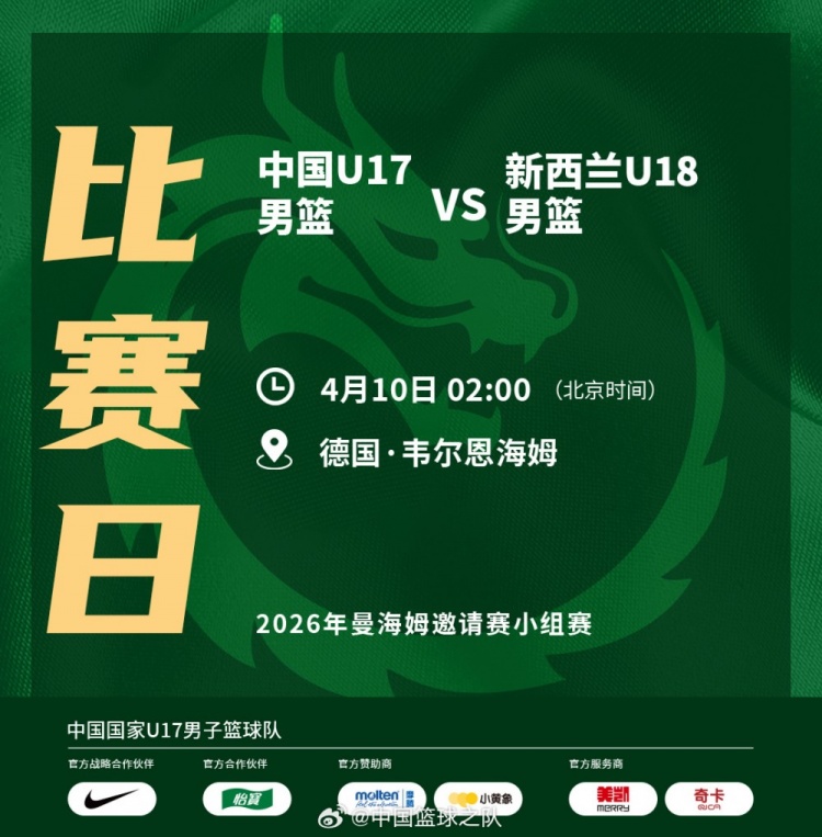 直播吧4月9日讯中国篮球之队发布赛事信息,明日中国U17男篮将迎来2026年曼海姆邀请赛小组赛收官战。