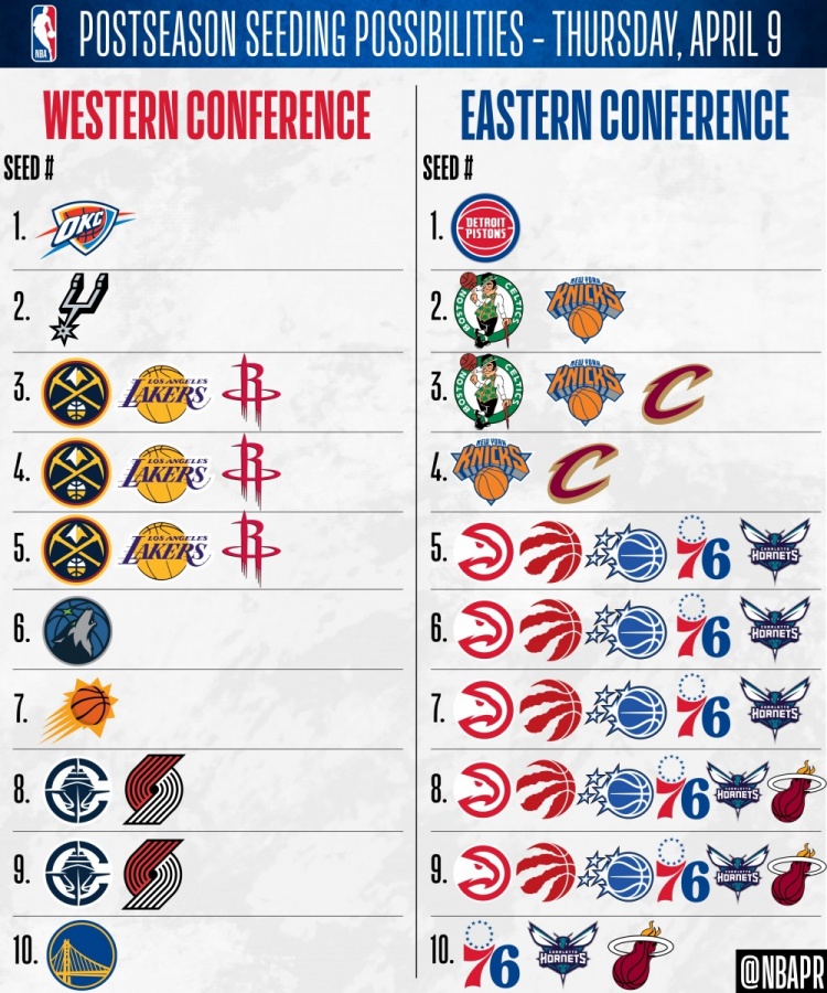 20支季后赛球队仅6队排名确定 其余14队最多的还有6种可能