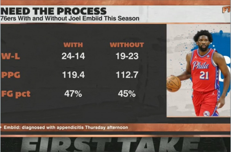 恩比德出战时76人24胜14负&场均119.4分 缺阵时19胜23负&112.7分