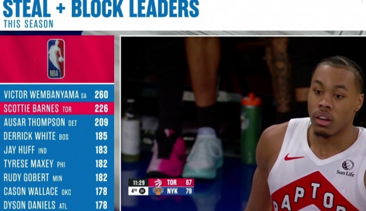 >本赛季抢断+盖帽数榜:文班260断档第一 巴恩斯第二 奥萨尔第三