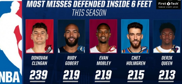 6英尺内防守致对手投丢次数榜:克林根239球第1 戈贝尔莫布里前三