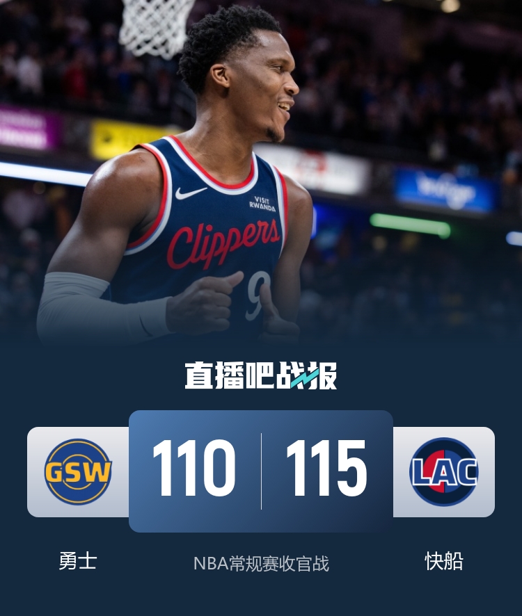 首节对决双方开局短暂拉锯后,勇士以一波7-0取得领先抢占先机,不过快船后程发力迅速追上开启拉锯战;次节拉锯勇士受困外线远投手感不佳逐渐落入被动最多落后11分,不过最后时刻他们回敬7-0的攻势止血追至4分进入下半场。休息归来双方都加强进攻但场面依旧拉锯,两队单节均攻下30+得分但其间最大分差不过6分,不过末节开局局面风云突变,快船送上一波13-4的攻势一举拉开比分,勇士虽然重新换上库里等核心但无济于事。最终,快船主场击败勇士用胜利为常规赛收官。