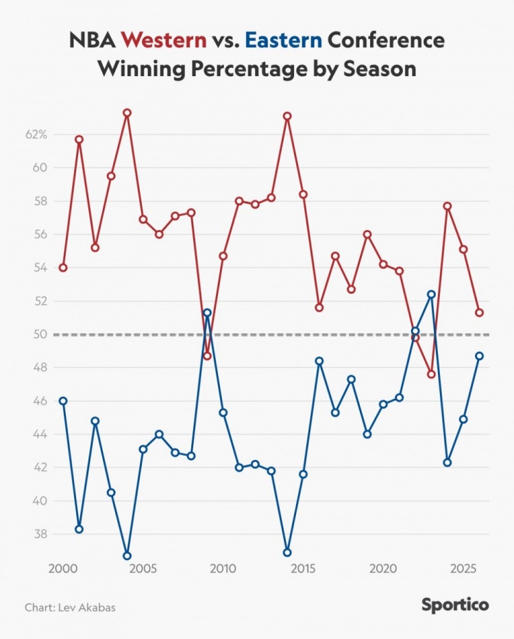 >近27季东西球队对话西部24次占优!美媒:还有哪项运动更一边倒?