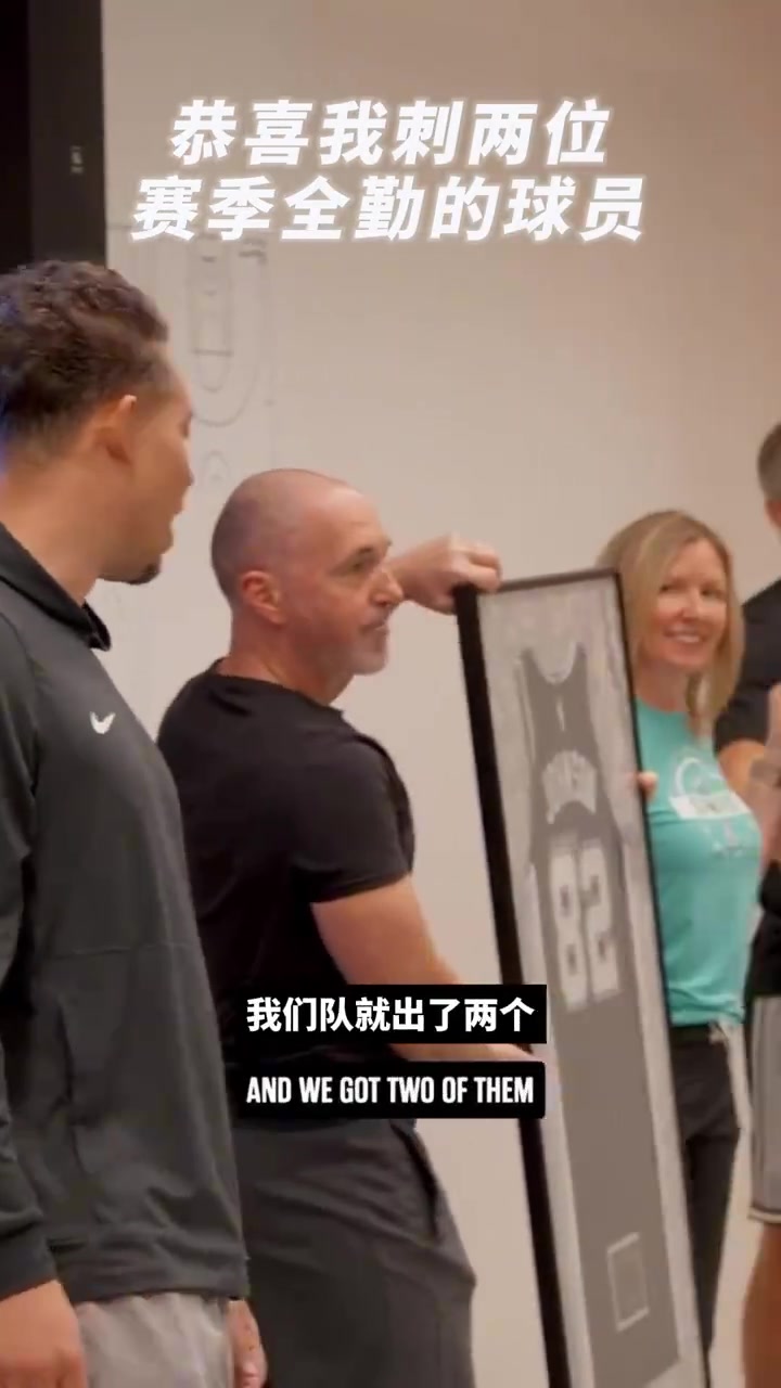 NBA仅18人!米奇·约翰逊为82场全勤的尚帕尼&凯尔登颁发荣誉球衣