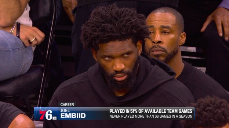 太脆了!恩比德生涯出勤率仅51% 单赛季出战场次从未超过68场