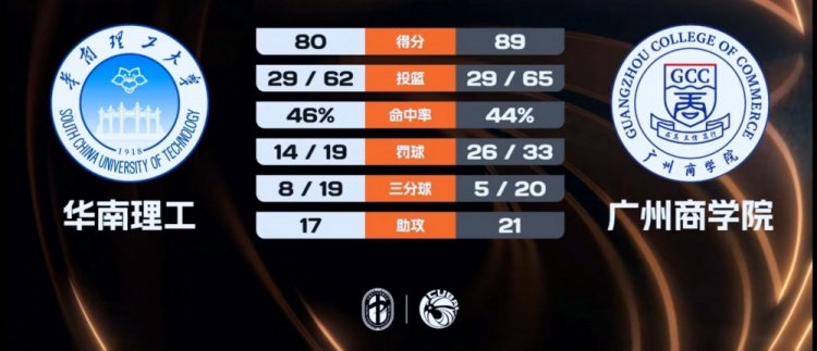 末节比赛,双方命中率均有下降,3分钟的时间里双方合计仅拿到2分,张旭连送助攻带队打破得分荒,李金权补篮得手,广州商学院保持场上优势,郭梓昊连续拿分苦苦追赶无果。最终,广州商学院89-80力克华南理工。