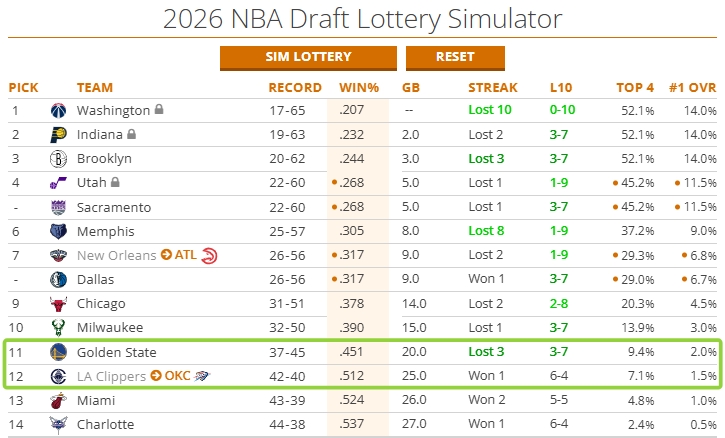 如果勇士赢球,快船首轮签获得前四顺位的概率从7.1%涨至9.4%,状元签概率从1.5%涨至2.0%。