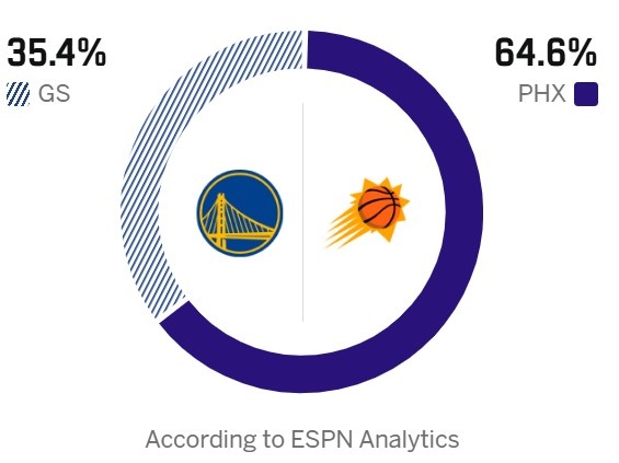 今天,ESPN预测本场比赛胜率,勇士35.4%,太阳64.6%。