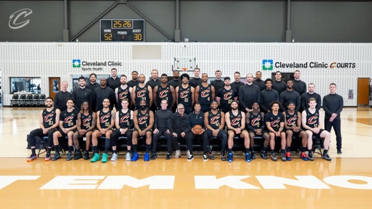 >骑士全队拍摄赛季全家福 哈登&米切尔戴发带出镜