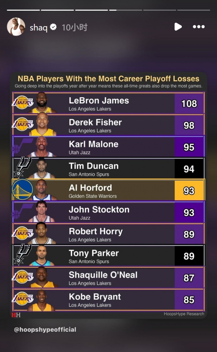 奥尼尔转发季后赛输球榜:詹姆斯108负第1 霍福德93负第5 OK前10