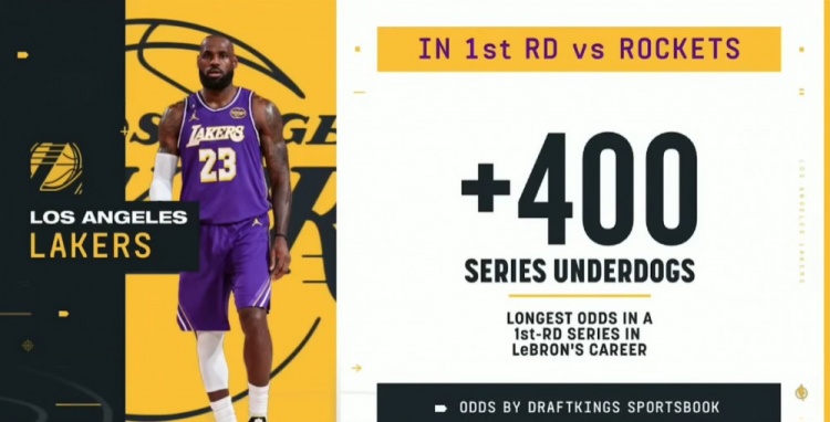 据ESPN统计,湖人首轮战胜火箭晋级的赔率为+400(投注100,若押中连本带利得500),这是詹姆斯生涯其所在球队在季后赛首轮的最差赔率。