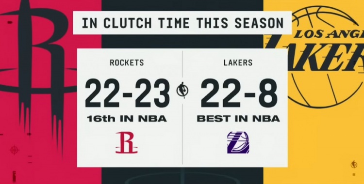 >打到关键时刻有戏?湖人本季关键时刻战绩22-8联盟第一 火箭第16