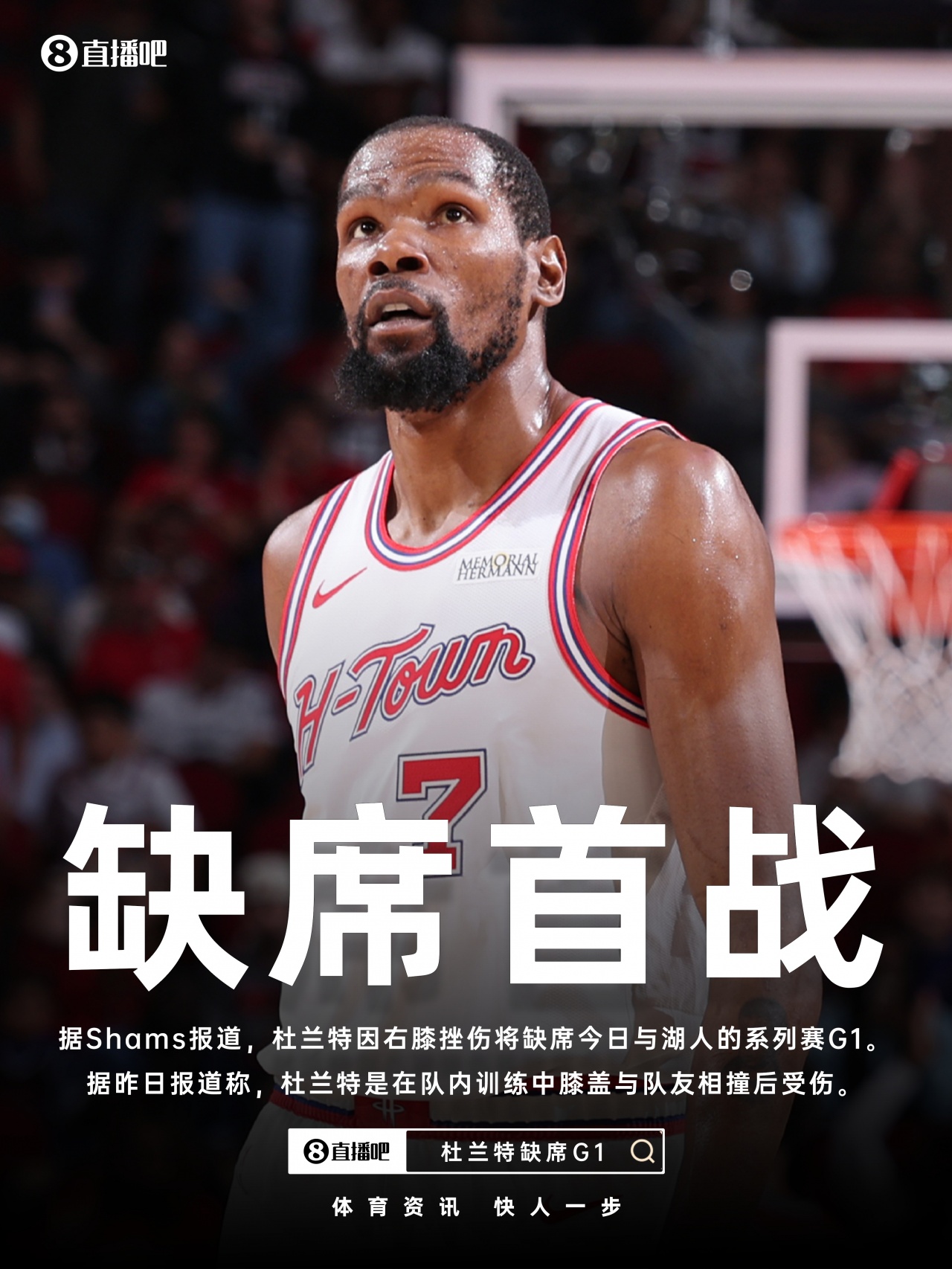 直播吧04月19日讯 据ESPN名记Shams报道,火箭当家球星凯文·杜兰特因右膝挫伤将缺席今日与湖人的系列赛G1!