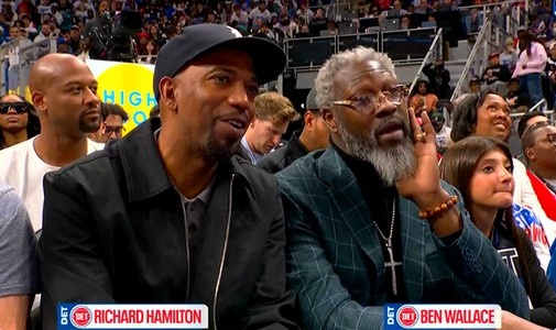 期待后辈重塑辉煌!大本与面具侠汉密尔顿现场观战活塞与魔术比赛