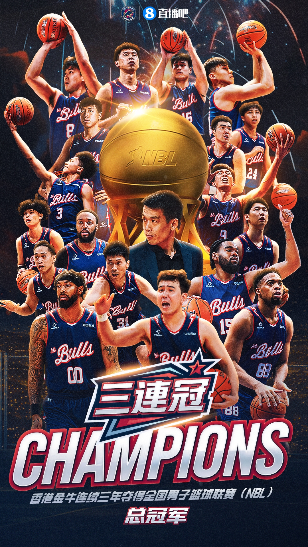 历史首个3连冠🏆官方合作媒体直播吧祝贺香港金牛再夺NBL总冠军