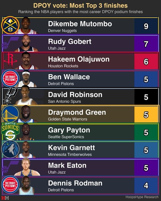 >DPOY投票前三次数:穆托姆博9次第一 戈贝尔7次第二 大梦第三