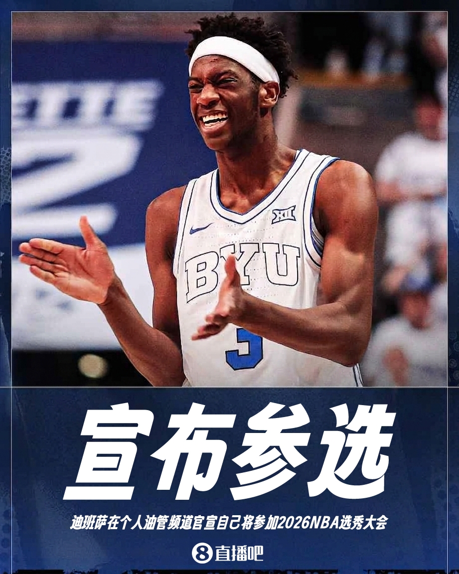 直播吧04月23日讯 今日,2026年NBA状元大热AJ·迪班萨通过个人油管频道宣布,自己将参加2026NBA选秀大会。