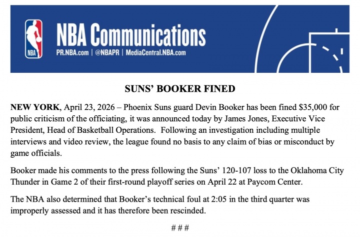 直播吧04月24日讯 NBA官方宣布,布克因公开批评裁判被罚35000美元。