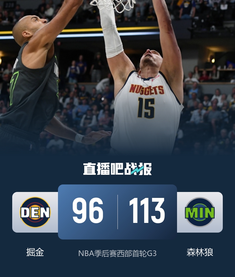 直播吧4月24日讯 NBA季后赛首轮G3,森林狼回到主场迎战掘金。前两场比赛,双方战成1-1。本场比赛,戈登缺阵。