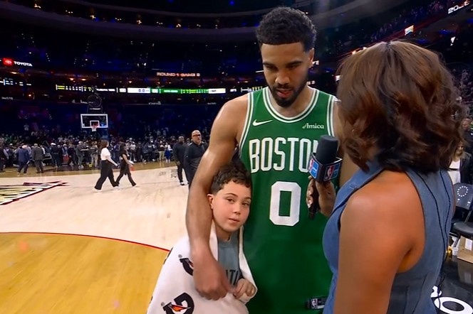 >小朋友挺可爱!赛后塔图姆带着儿子接受采访