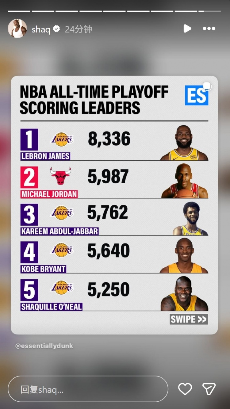>奥尼尔转发季后赛历史得分前五:詹姆斯8365独一档 乔丹5987第二