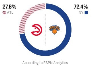 今天,ESPN预测本场比赛胜率,尼克斯72.4%,老鹰27.6%。