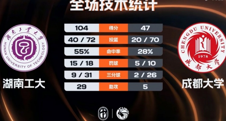 湖南工大:王磊20分5板,吴子煜16分5板2助,肖俊恺12分3板2助4断,杨李杰11分5板7助,郑俊豪10分5板6助2断,祁宏升10分5板,司家丞7分3板4助2断,蒋奇宏6分2板2断