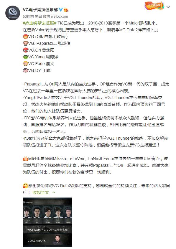尽管在战队注册页面有细心的水友发现VG五名队员已经完成登记,尽管VG已经在推特上确认新阵容,但当VG官博真正发布新赛季的人员名单时,粉丝们悬着的心才缓缓落下。今天中午,VG俱乐部发布公告,宣布了新赛季的人员阵容。