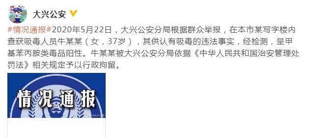 6月24日,大兴公安 通报演员牛萌萌因吸毒被行政拘留。通报内容如下:2020年5月22日,大兴公安分局根据群众举报,在本市某写字楼内查获吸毒人员牛某某(女,37岁),其供认有吸毒的违法事实,经检测,呈甲基苯丙胺类毒品阳性。牛某某被大兴公安分局依据《中华人民共和国治安管理处罚法》相关规定予以行政拘留。