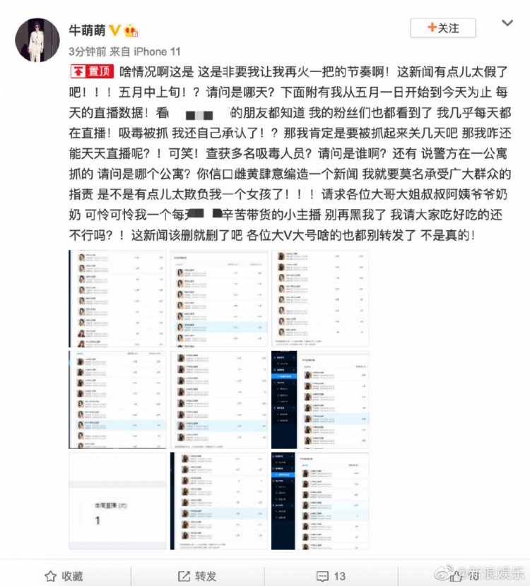 6月23日,牛萌萌被曝吸毒,几度否认后,当晚在直播中又再次否认吸毒传闻,表示:“我挺好的,新闻是假的”,还否认自己恶意炒作,认为自己没有这个必要。