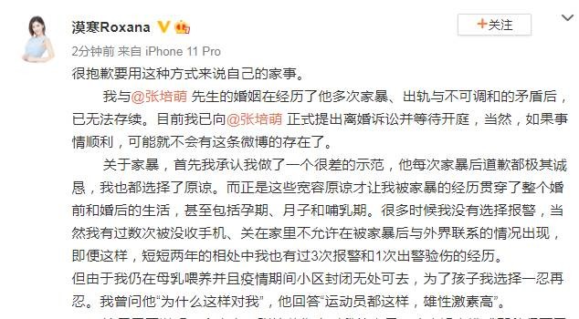 我与@张培萌 先生的婚姻在经历了他多次家暴、出轨与不可调和的矛盾后,已无法存续。目前我已向@张培萌 正式提出离婚诉讼并等待开庭,当然,如果事情顺利,可能就不会有这条微博的存在了。