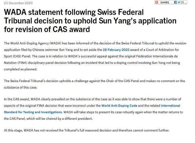直播吧12月24日讯 央视网体育消息,世界反兴奋剂机构(WADA)于当地时间23日发声明称,已得知瑞士联邦法院支持孙杨对CAS判决的改判请求,会积极采取行动,在案件回到国际体育仲裁法庭后,继续陈述其立场。