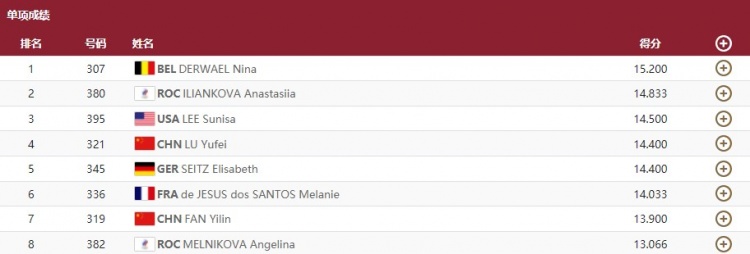 最终,比利时选手德维尔夺金,芦玉菲第4,范忆琳第7。