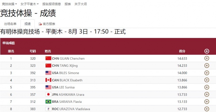 直播吧8月3日讯 刚刚结束的东京奥运会体操女子平衡木决赛中,中国选手锁定金牌。管晨辰最终成绩排名第一拿到金牌,唐茜靖排名第二拿到银牌,美国选手拜尔斯收获铜牌。