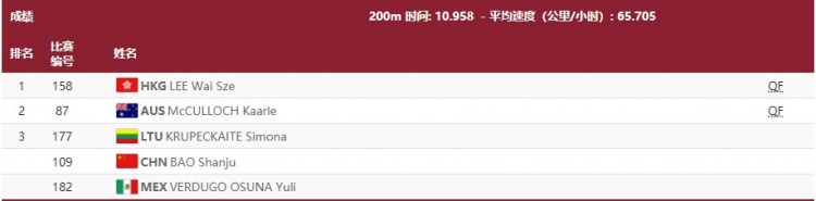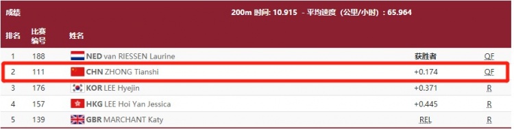 最终,钟天使以小组第二,落后第一名荷兰选手0.174秒的成绩成功晋级1/4决赛,鲍珊菊排名想小组第四进入复活赛,在复活赛中排名小组第五无缘1/4决赛。