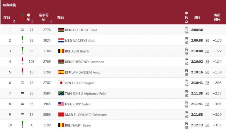 肯尼亚选手&马拉松之王基普乔格以2小时8分38秒的成绩成功卫冕,夺得银牌的是荷兰选手纳吉耶,铜牌获得者是比利时选手阿伯迪。