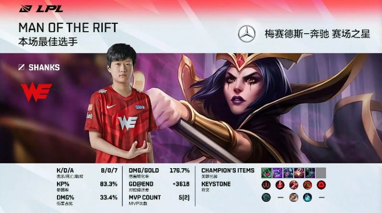 【17:25】格温TP下来绕后狂剪,芮尔开团不错拿到WE野辅人头,妖姬伤害拉满拿到三杀,艾希偷掉残血厄斐琉斯。