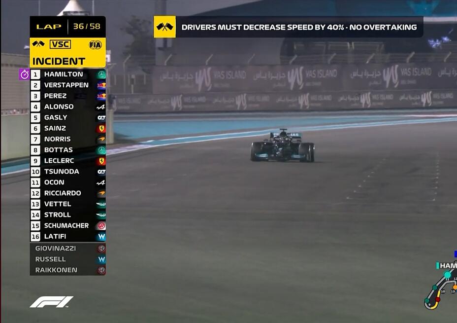 第36圈,吉奥维纳兹赛车出现问题,他的赛车停在缓冲区,赛会出动虚拟安全车。汉密尔顿不进站,维斯塔潘选择进站。