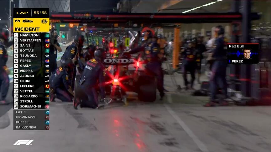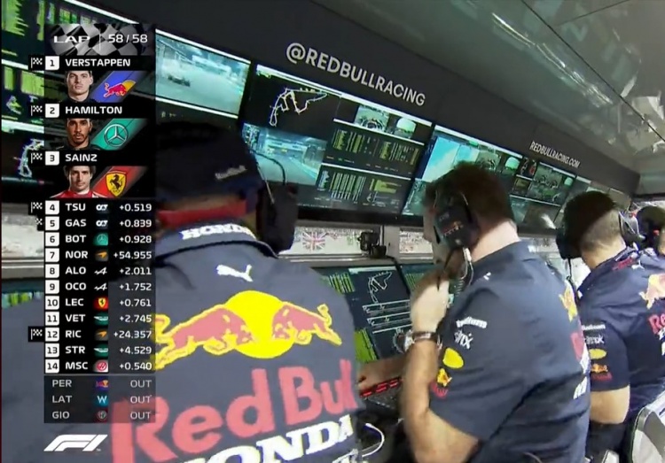 第12圈,汉密尔顿领先优势达到5秒,第14圈维斯塔潘选择进站换胎。第15圈,汉密尔顿进站换胎。