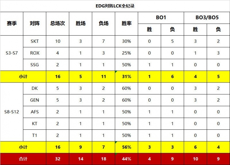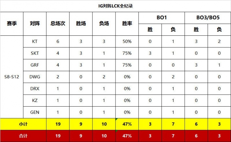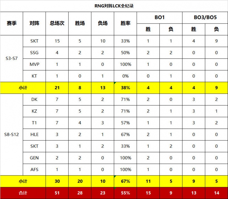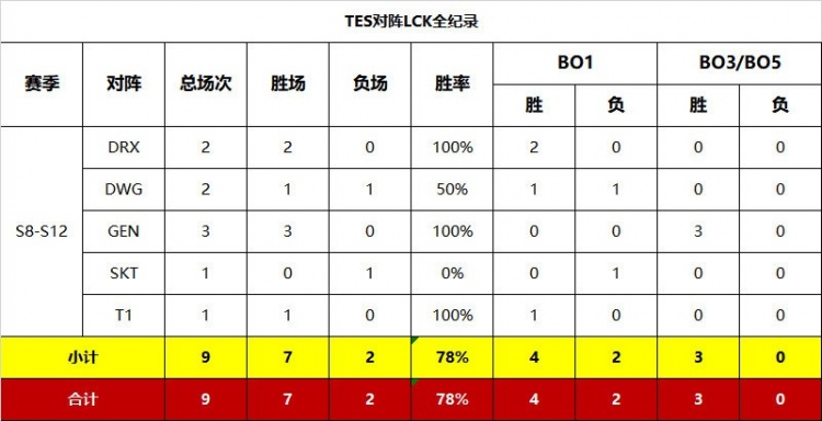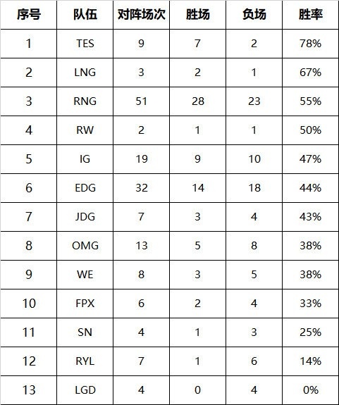 直播吧6月8日讯 近日有韩国网友整理出LPL队伍对战LCK赛区队伍的历史交手数据,其中胜率最高的是TES战队,队史中与LCK队伍一共交手9次,拿下了7胜2负的战绩,胜率为78%;而RNG是与LCK赛区队伍交手最多的LPL队伍,一共与LCK队伍交手51次,拿下28胜23负的战绩,胜率为55%。