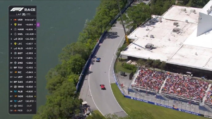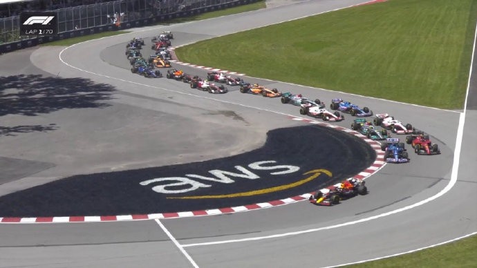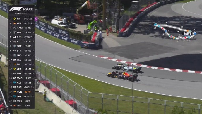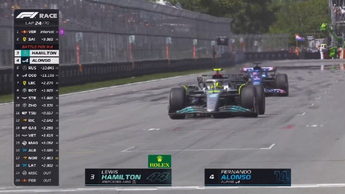 第5圈,维斯塔潘领先优势已经超过3秒。塞恩斯、阿隆索和汉密尔顿的差距非常接近,阿隆索在被塞恩斯超越后并没有掉队。周冠宇超车升到第九。↓