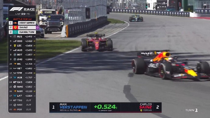 第59圈,维斯塔潘vs塞恩斯!头名的争夺非常激烈!↓
